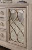 Made with hardwood solids, oak veneer and MDF substrate. Rich layered gray finish. Drawers with satin nickel-tone ring pulls; doors with round satin nickel-tone knobs. Top with thin inset metal frame in a satin nickel-tone finish. 3 drawers with dovetail construction, fully finished drawer interiors (top drawer is felt lined) and heavy-duty, ball-bearing side glides. 2 cabinets with decorative fretwork and antiqued mirror panel doorsAssembly required. Estimated Assembly Time: 15 Minutes.