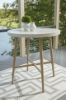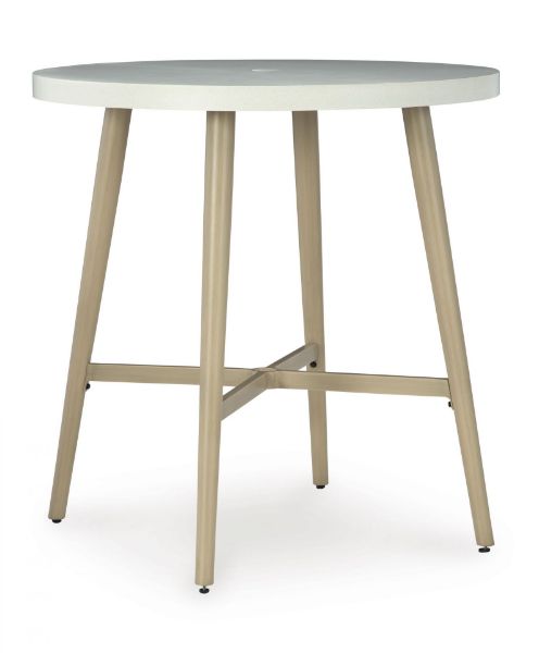 This bar table invites your casual contemporary style outdoors. With an elegant sintered stone top, it expertly marries refined design with durability. At this table, breezy summer mornings and cold winter nights are made all the more enjoyable. Made with aluminum. Stone look tabletop. Legs with wood-look painted finish. Stainless steel hardware. Designed to withstand the harsh elements of the outdoors. Umbrella hole with cover cap (umbrella sold separately). Assembly required. Estimated Assembly Time: 15 Minutes.