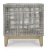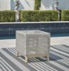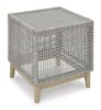 This end table invites your casual contemporary style outdoors. With its resin wicker in a chic neutral hue, it expertly marries refined design with durability. Breezy summer mornings and cold winter nights are made all the more enjoyable with a glass tabletop on hand to hold beverages, snacks and your latest poolside read. All-weather resin wicker over aluminum frame. Legs with wood-look painted finish. Tempered glass tabletop. Stainless steel hardware. Designed to withstand the harsh elements of the outdoors. Assembly required. Estimated Assembly Time: 30 Minutes.