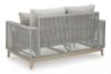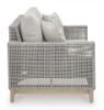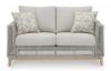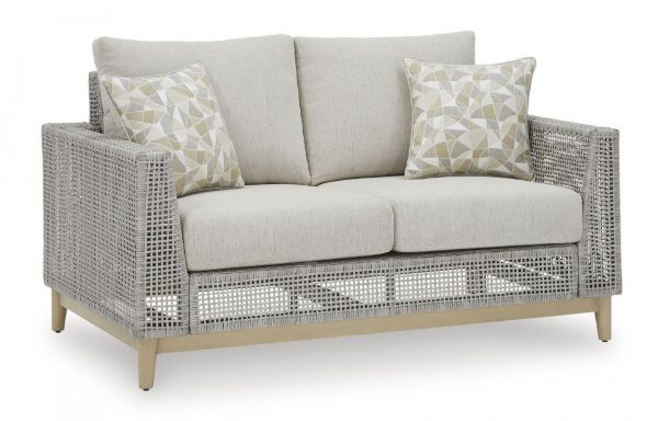 This loveseat invites your casual contemporary style outdoors. With its resin wicker in a chic neutral hue, it expertly marries refined design with durability. Breezy summer mornings and cold winter nights are made all the more comfortable with high-performance Nuvella+ fabric covering the cushion. All-weather resin wicker over aluminum frame. Legs with wood-look painted finish. Solution-dyed high-performance fabric. Nuvella+ is an outdoor fabric that can be cleaned and offers enhanced UV resistance. Clean fabric with mild soap and water, let air dry; for stubborn stains, use a solution of 4 oz. bleach to 28 oz. water. 2 throw pillows included. Stainless steel hardware. Designed to withstand the harsh elements of the outdoors. Assembly required. Estimated Assembly Time: 60 Minutes.