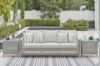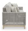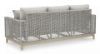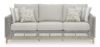 This sofa invites your casual contemporary style outdoors. With its resin wicker in a chic neutral hue, it expertly marries refined design with durability. Breezy summer mornings and cold winter nights are made all the more comfortable with high-performance Nuvella+ fabric covering the cushion. All-weather resin wicker over aluminum frame. Legs with wood-look painted finish. Solution-dyed high-performance fabric. Nuvella+ is an outdoor fabric that can be cleaned and offers enhanced UV resistance. Clean fabric with mild soap and water, let air dry; for stubborn stains, use a solution of 4 oz. bleach to 28 oz. water. 4 throw pillows included. Stainless steel hardware. Designed to withstand the harsh elements of the outdoors. Assembly required. Estimated Assembly Time: 45 Minutes.