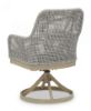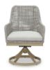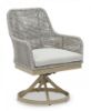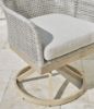 This swivel dining chair invites your casual contemporary style outdoors. With its resin wicker in a chic neutral hue, it expertly marries refined design with durability. The chair's 360-degree swivel makes it easy to switch from watching the kids at the pool to grabbing a drink from the table. And breezy summer mornings and cold winter nights are made all the more comfortable with high-performance Nuvella+ fabric covering the seat cushion. All-weather resin wicker over aluminum frame. Base with wood-look painted finish. Solution-dyed high-performance fabric. Nuvella+ is an outdoor fabric that can be cleaned and offers enhanced UV resistance. Clean fabric with mild soap and water, let air dry; for stubborn stains, use a solution of 4 oz. bleach to 28 oz. water. Stainless steel hardware. 360-degree swivel. Assembly required. Estimated Assembly Time: 30 Minutes.