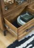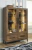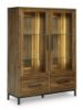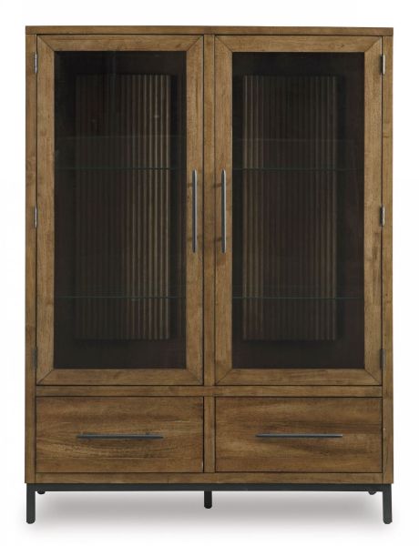 Cool, chic and crafted for the everyday, this display cabinet is well-suited to your urban contemporary character. It pairs the natural beauty of wood with black metal for a luxe industrial feel. LED accent lighting and reeded back panels upgrade your display space, acting as a beautiful backdrop for china, collectibles or other decor. And with this cabinet's velvet-lined, soft-close drawers, sleek dining room storage is nearly effortless. How’s that for relaxed refinement? Made with rubberwood solids, mango wood veneer, MDF substrate and metal Natural look wood finish Black metal legs; tapered black metal bar pulls Glass-front doors Adjustable glass shelves 2 drawers with fully finished interior, dovetail construction and ball-bearing side glides; lined in black velvet LED accent lighting Power cord included; UL Listed Assembly required Estimated Assembly Time: 15 Minutes