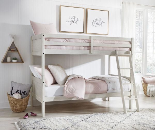 Elegant, timeless furnishings take your bedroom to the next level. Nothing does that better than this twin over twin bunk bed. The antiqued white finish with a wonderful grain texture gives this youthful bed a sophisticated touch. And with its space-saving design, it adds a layer of must-have function to a kid’s bedroom.
