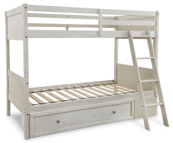 Includes twin bunk bed panels and twin ladder/rails/slatsMade with hardwood solids, birch veneer and MDF substrateAntiqued white finish with grain textureTop bunk with protective side railsSturdy ladder leads to top bunkThe Consumer Product Safety Commission states top bunks not be used for children under 6 years of ageBed does not require additional foundation/box spring; accommodates most zero clearance adjustable basesMattresses available, sold separately?Assembly requiredEstimated Assembly Time: 60 Minutes