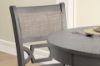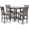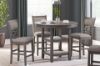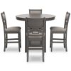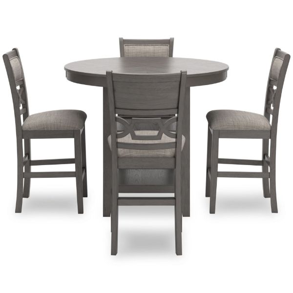 Can’t decide between classic and contemporary? Embrace the beauty of transitional style with this casually sophisticated counter height dining table and bar stools. A clean-lined profile and modern light gray finish merge with textured upholstery to create a timeless yet on-trend look when guests gather. Discreetly placed shelves simply make great storage sense. Includes counter height dining table and 4 upholstered bar stools Table made with rubberwood solids, mindi veneer and MDF substrates Stool made with solid wood and engineered wood Light gray finish Tabletop has reverse diamond patterned veneer Thick tapered legs 2 lower shelves Stool with light gray textured polyester upholstery Foam cushioned seat and backrest Stool backrest features fretwork accent Seats up to 4 Assembly required Estimated Assembly Time: 60 Minutes