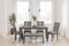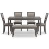 Can’t decide between classic and contemporary? Embrace the beauty of transitional style with this casually sophisticated Langwest dining table, chairs and bench ensemble. A clean-lined profile and modern light gray finish merge with textured upholstery to create a timeless yet on-trend look when guests gather. Includes dining table, 4 upholstered chairs and bench Table made with rubberwood solids, mindi veneer and MDF substrates Chair and bench made with solid wood and engineered wood Light gray finish Chair and bench with light gray textured polyester upholstery Foam cushioned seat and backrest Chair backrest features fretwork accent Tabletop has reverse diamond patterned veneer Table with tapered legs Seats up to 6 Assembly required Estimated Assembly Time: 60 Minutes